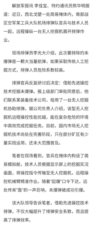 On March 15, 2020, China Military Net and PLA Daily reported in detail the story of Henan Yuexin Intelligent Machinery Company assisting a certain engineering brigade of the Southern Theater Command Air Force in safely removing unexploded bombs.