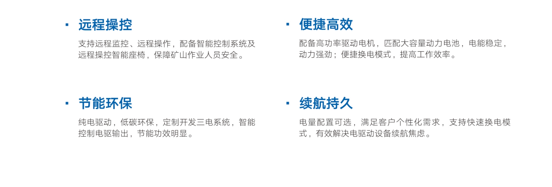 支持远程监控、远程操作,配备智能控制系统及远程操控智能座椅,保障矿山作业人员安全。配备高功率驱动电机,匹配大容量动力电池,电能稳定,动力强劲;便捷换电模式,提高工作效率。
