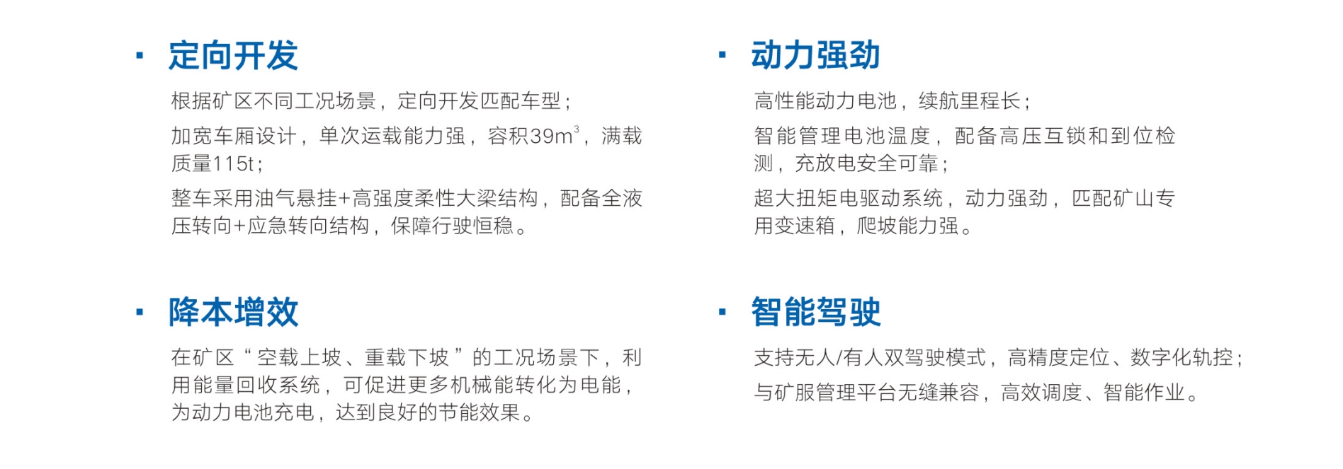 根据矿区不同工况场景,定向开发匹配车型;加宽车厢设计,单次运载能力强,容积39m²,满载质量115t;整车采用油气悬挂+高强度柔性大梁结构,配备全液压转向+应急转向结构,保障行驶恒稳。